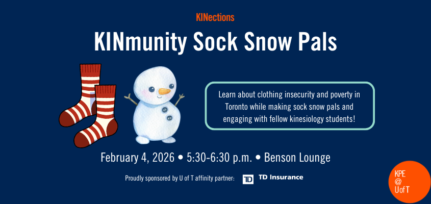 The event will feature trivia on these topics, a hands-on sock snow pal crafting activity for attendees to take home, and hot chocolate as a cozy creativity snack. Join KINmunity Sock Snow Pals to connect with kinesiology students across different years, unwind after a long day of classes, and create a snow pal for yourself or a friend!