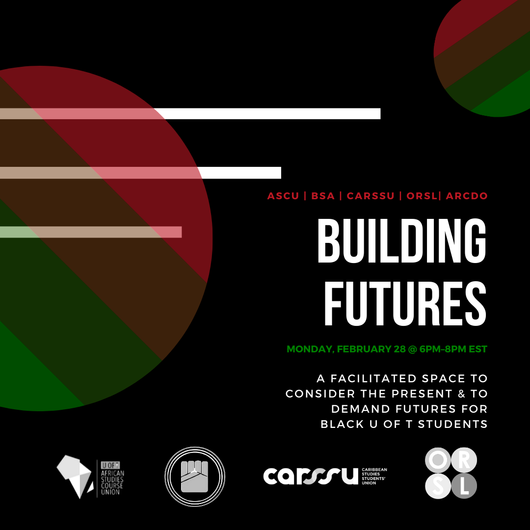 Building Futures is a facilitated, conversational space for Black students to reflect on the experience of being Black at U of T and in the world more broadly, and to offer suggestions toward futures here on campus. The event will be held February 28, 2022, from 6 - 8 p.m. ET over Zoom.
