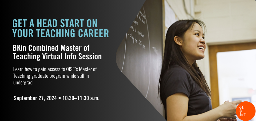 Interested in a career in teaching? Come to the BKin Combined Master of Teaching info session that will be held virtually on Friday, September 27 from 10:30–11:30 a.m.